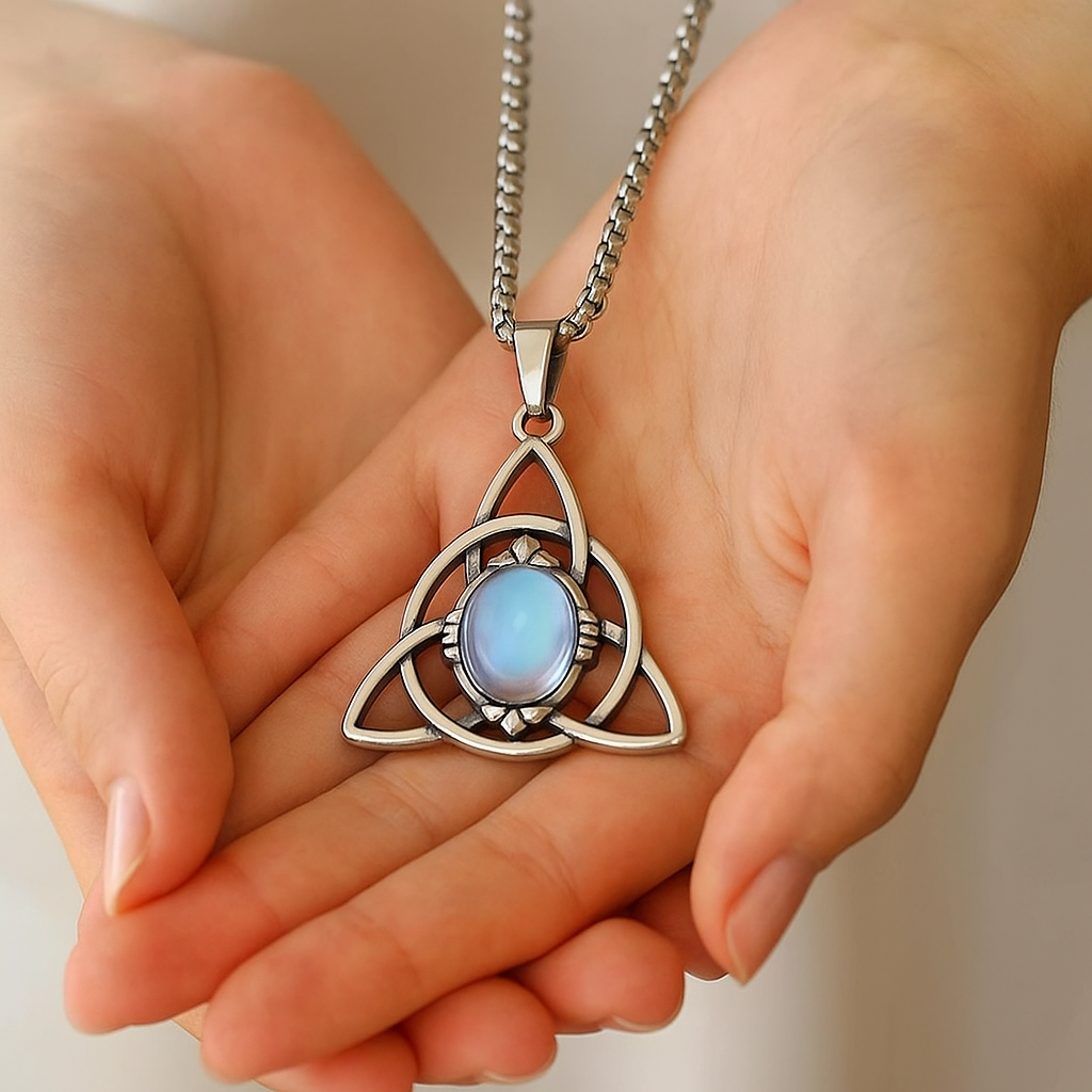 The Mystical Moon Triquetra Necklace blends meaningful symbolism and lasting design. The Triquetra — an ancient symbol of unity and spiritual protection — encircles a glowing moon representing clarity, renewal, and feminine wisdom.
