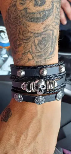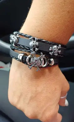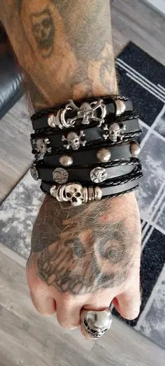 The Punk Skull Leather Bracelet Set is crafted from premium-quality leather bands paired with iconic skull charms. Each piece is built for durability and designed to showcase rebellious style and bold masculinity—perfect for men who wear their attitude with pride.