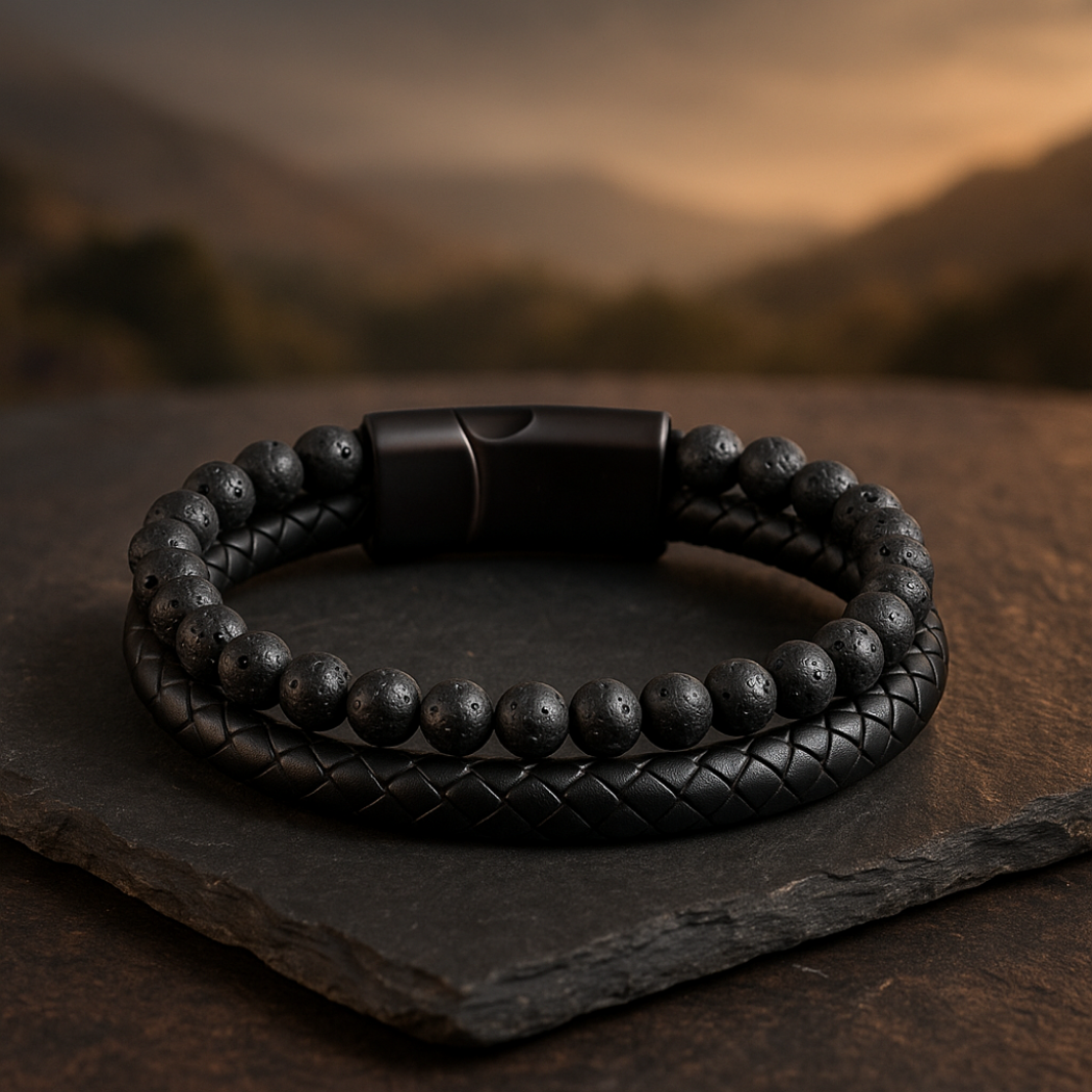 Our bracelet is thoughtfully handcrafted using natural lava rock beads, braided genuine leather, and a sleek magnetic stainless steel clasp. Each element is chosen for its unique combination of earthy power, durability, and masculine style.